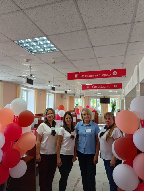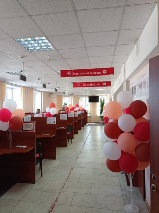 В честь праздника зал филиала по Ковылкинскому району был украшен воздушными шарами в цветовой палитре бренда «Мои документы»