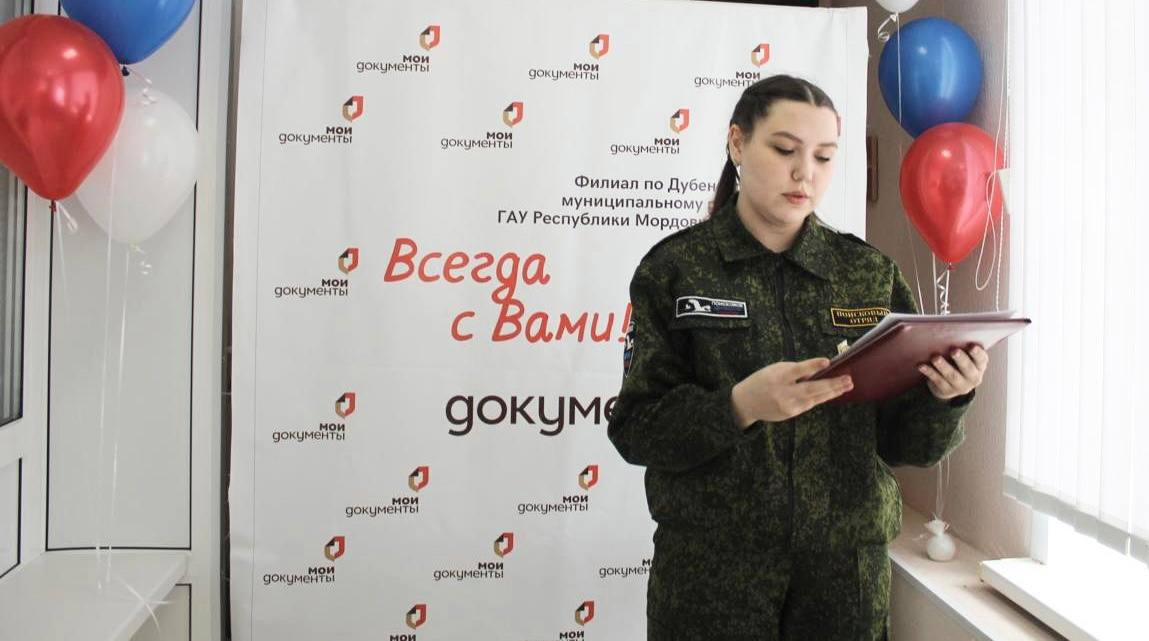 22 февраля в Филиале ГАУ Республики Мордовия «МФЦ» по Дубенском муниципальному району состоялось торжественное мероприятие, приуроченное ко Дню защитника Отечества. На нем присутствовали школьники, впервые получающие паспорт гражданина РФ, участник специальной военной операции, а также участники конкурса рисунков.